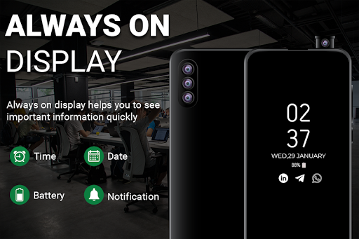 If you want to see what's going on your phone, you can simply take your phone out of your pocket to view all the latest notifications, in a similarly pleasing and minimalist manner by using this best Always on Display app. always on display digital clock if you have a fingerprint scanner and the always on display is on, when you go to scan your fingerprint it does unlock your phone always on display Samsung. The app (Always On Display Screen) is designed for this proposes to show some basic information in black screen whenever you want.
