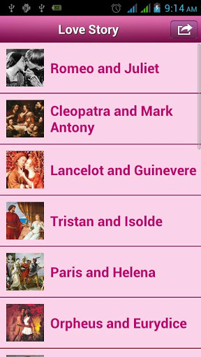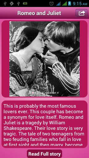Most romantic love stories contains more than 30+ true love stories from all over the world.Everyone searching for true love in the world. Love if we define the word than its just the most precious time of life, the feelings that never ends, the beauty that never get dull, relation that is above all relations.Get amazed and romantic with the true lovers stories in this world with its historical heritage.Application contains Story of below characters:- Romeo and Juliet- Cleopatra and Mark Antony- Lancelot and Guinevere- Tristan and Isolde- Paris and Helena- Orpheus and Eurydice- Napoleon and Josephine- dysseus and Penelope- Paolo and Francesca- Jane Eyre and Rochester- Layla and Majnun- Eloise and Abelard- Pyramus and Thisbe- Elizabeth Bennett and Darcy- Salim and Anarkali- Pocahontas and John Smith- Shah Jahan and Mumtaz Mahal- Queen Victoria and Prince Albert**********features***********List of love stories,images for all love stories,Manage your favourites,Share love stories with your loved once.(via facebook email twitter .Keywords: Romantic, Romance, Heart touching, History, Amazing, Memorable, Historical, Love, Story, Stories.