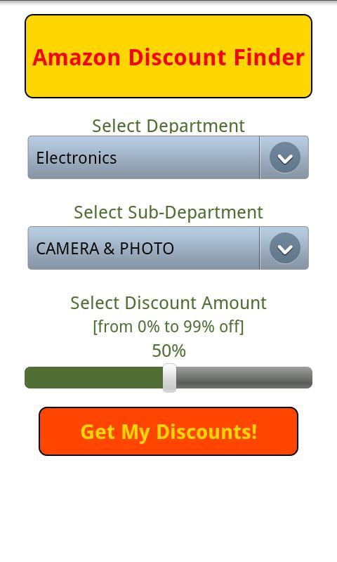 amazon Discount Finder – find the hot, hidden discount deals on the Amazon megastore! This is a search engine app which delivers all the available Amazon discounts for just about every item on the mega shopping store. Currently available for: * amazon.com [USA] * amazon.co.uk [UK] * amazon.ca [Canada] Forthcoming Features: * amazon.fr [France] integration * amazon.de [Germany] integration * 3rd tier level Search Feature