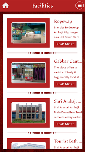Through this Ambaji Temple app, you can find the detailed information of Ambaji Temple and pilgrims facilities made available by Shri Arasuri Ambaji Mata Devasthan Trust which will help you plan your visit to Ambaji and make your journey comfortable. The app contains the basic information regarding accommodation, food, parking, and other trust activities provided by SAAMDT.