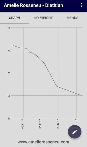 Amelie Rosseneu's Tracking app tracks dieter's weight and displays their personalized menus. It is only available for Amelie's clients via username and password that were given during dietitian meetings.