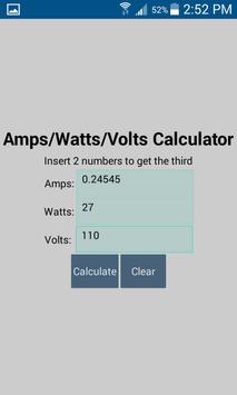 Easily calculate Amps, Watts, or Voltage using this app. Get Amperage using Watts and Volts. Get Wattage using Amps and Volts. Get Voltage using Amps and Watts.