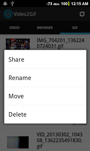 *export, rename, share gif. You can long press an animation at the Library tab and select move, rename or share the gif animation.