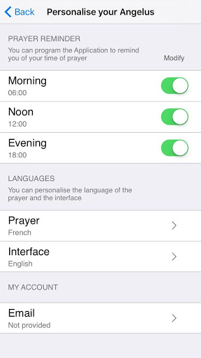 To customize your app, schedule your appointment prayer; send your intentions to the Sisters of the Assumption in Lourdes; made ring the bells; choose your language of prayer (French, Latin, English, Spanish, Portuguese); and the language of your app (English, French, Spanish, Portuguese).