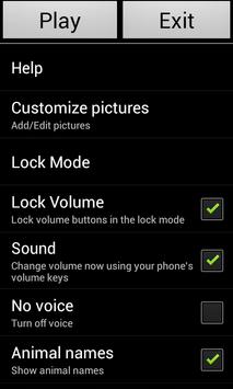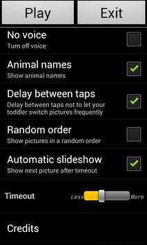 Parents can change numerous settings like random or sequential slide show, timeout between images, turning off animal names etc.