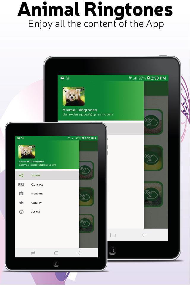 The images contained in this application Animal ringtones, animals sounds free (animals and their sounds), have been downloaded from free Internet sites, free images that have no intellectual property.