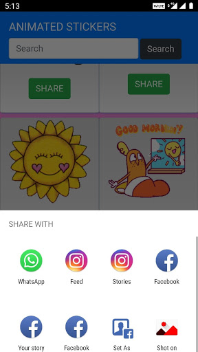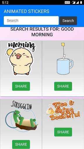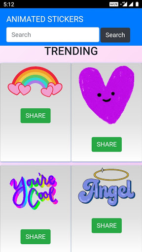 Get animated stickers of your choice. Browse through trending stickers and share your favorite ones. Look up for the stickers of your choice using search and use the share button to share the sticker of your choice in gif image to your social networking apps. One click share button lets you instantly share the sticker to the apps installed in your device.