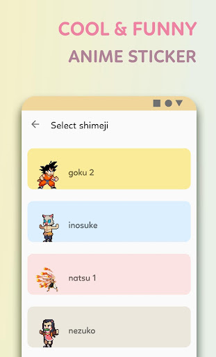 The app supports a lot of animated stickers of many famous characters, such as Songoku (Dragon Ball), Naruto, Natsu (Fairy Tail), Tanjirou (Demon Slayer), Nezuko (Kimetsu no Yaiba), Erza, Lucy, etc.