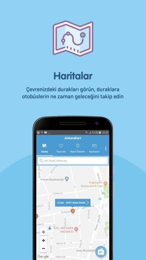 AnkaraKart & N Kolay Ankara ile harita üzerinde çevrenizdeki durakları görebilir, duraklara otobüslerin ne kadar süre sonra geleceğini takip edebilir ve duraktan geçen hatları izleyebilirsiniz.