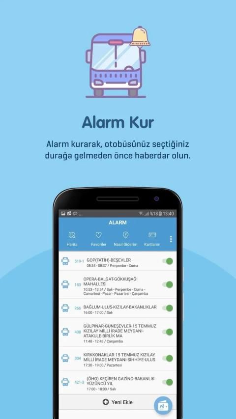 Düzenli olarak kullandığınız otobüs hattı numarasını tanımlayarak bineceğiniz durak ve yolculuk saatine göre alarm kurabilir, yolculuğunuz öncesinde bildirim alabilirsiniz.