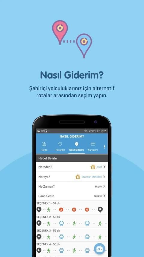 Gitmek istediğiniz noktanın yer bilgisi, tarih ve saat detayını girerek bir ulaşım rotası oluşturabilir, gitmek istediğiniz noktaya nasıl gideceğiniz hakkında bilgi alabilirsiniz.