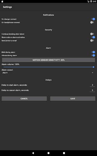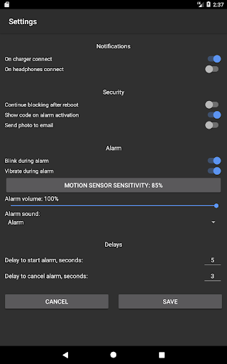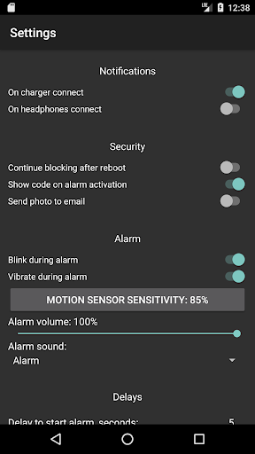 Wide settings of the application allow you to make the alarm triggers only when you need it, without false positives and with the necessary special effects.