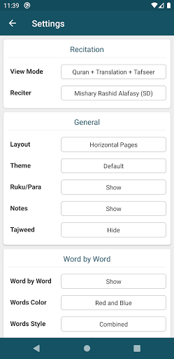 - Ability to show/hide Word by Word, Quran Translation (Tarjuma) and Tafseer