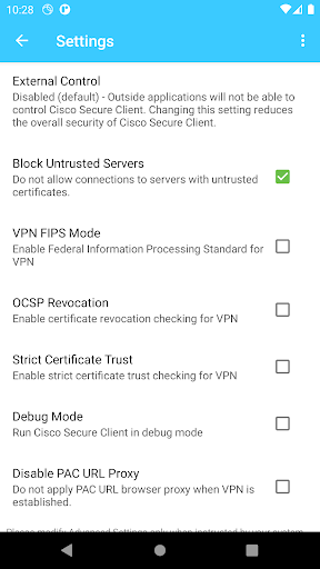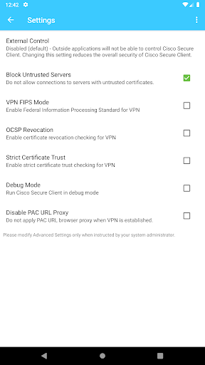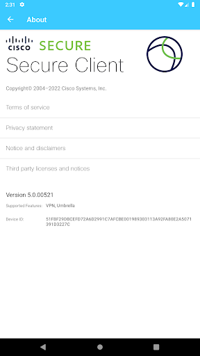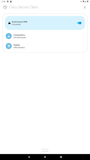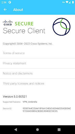 Cisco Secure Client provides reliable and easy-to-deploy encrypted network connectivity from devices by delivering persistent corporate access for users on the go. Whether providing access to business email, a virtual desktop session, or most other Android applications, Cisco Secure Client enables business-critical application connectivity.