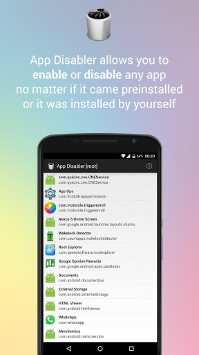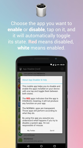 With this app you can disable or enable both your user-installed apps and the preinstalled Android apps. With one tap, you can toggle between enabled and disabled states.