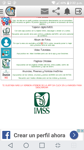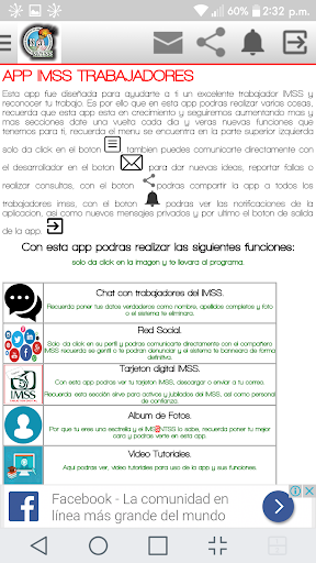 COM سيكون هذا التطبيق قادرا على الدردشة مع عمال IMSS الآخرين، واستشر بطاقات المعايدة الخاصة بك، والتحقق من IMSS، و SNTSS PUEBLA، والدورات، وثائق IMSS، من بين العديد من الأشياء.إنه تطبيق مهم للغاية لجميع عمال IMSS لمشاركتها.