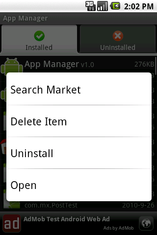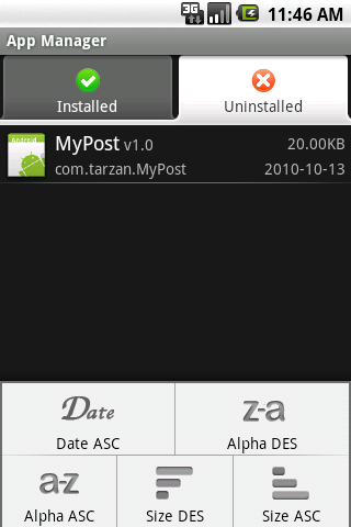 App manager FreeApp ManagerFreecan collect apps you have installed,you can use it to:1.list installed apps by date descending;2.Sort the list by alpha,size or date;3.Click one to open,uninstall,search in market,delete this item.4.Once installed it,it can list uninstalled apps.Notice:This free version can not backup apk to sdcard.