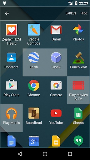 Change the visual look and feel of the app organizer via settings. You can for example change colors, grid size and remove app names.