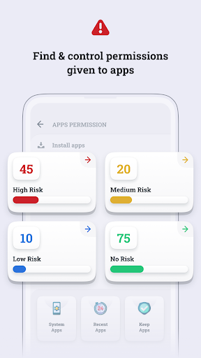 1. Apps permission: in this feature we have categorised permissions in different risk levels i.e, High, Medium, Low, No Risk & also we have categorised apps i.e, System apps, Recent apps, and Keep Apps so these features will be easy for your task. if You want to revoke particular permission from particular apps You can quickly do that with this feature with one tap.