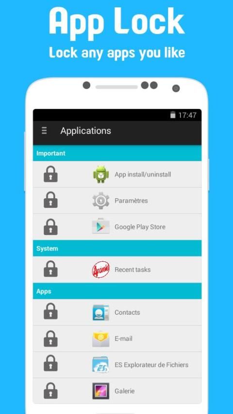 AppLocker can lock SMS, Contacts, Gmail, Facebook, Gallery, Market, Settings, Calls and any app you choose, with abundant options, protecting your privacy.