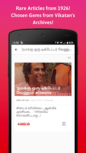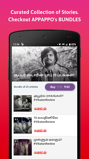 APPAPPO also contains the best stories, novels and articles published by Vikatan from 1926. You can read selected articles about India's Independence Struggle, Tamil Language Movement, Tamil Political History, Interviews by Rajinikanth, Kamal Hassan, Karunanidhi, Jayalalithaa and etc., These articles are available only in APPAPPO app. If you need curated collection of articles, you can find them in our BUNDLES section.