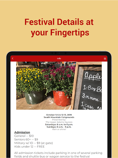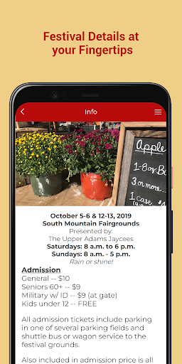 The Official National Apple Harvest Festival App! Experience everything you need for this old-fashioned, family-friendly festival right from the palm of your hands. Whether you're looking for an interactive and fully-immersive map or you're ready to purchase tickets, this app has everything you need. The National Apple Harvest Festival is held annually during the first two full weekends in October, just a few miles west of historic Gettysburg, Pennsylvania.