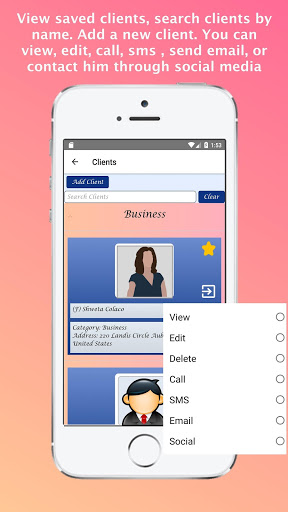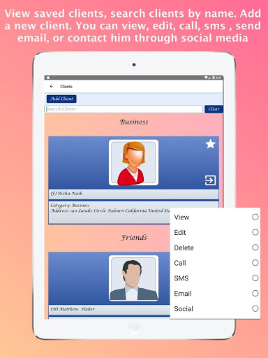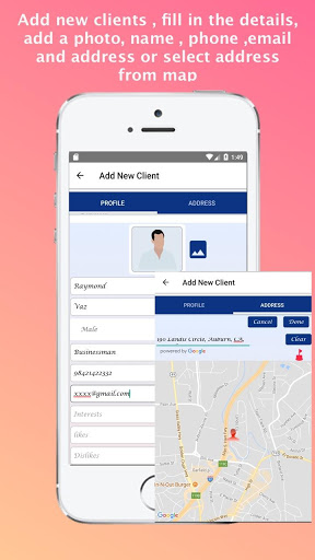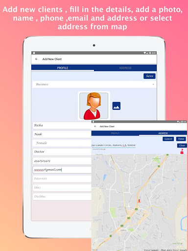 Add photo (not mandatory) to each client, store other details including address. Address can be stored either manually or using Map.