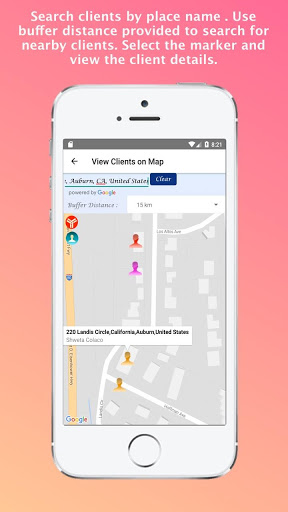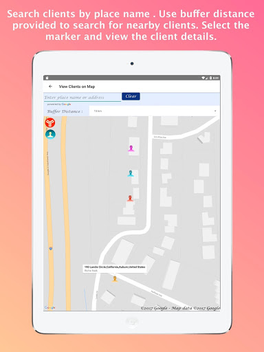 View clients on the map using our buffer distance functionality, get directions to their location from your location.