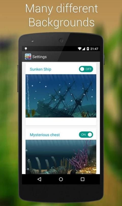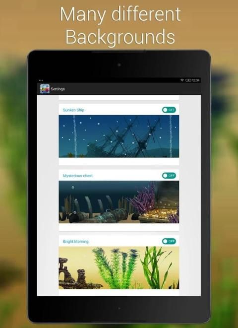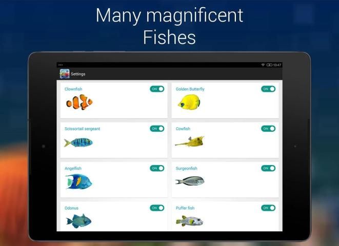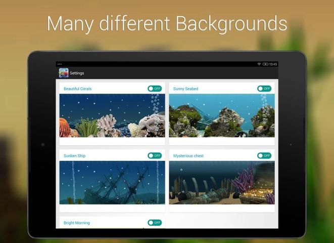 - different settings that allow you to change which and how many fishes you’ll have in your aquarium, turn on or off sunrays, bubbles, texture quality, etc.