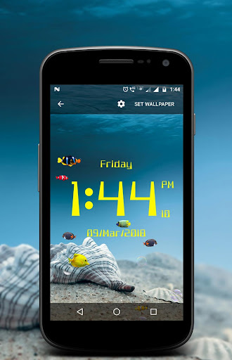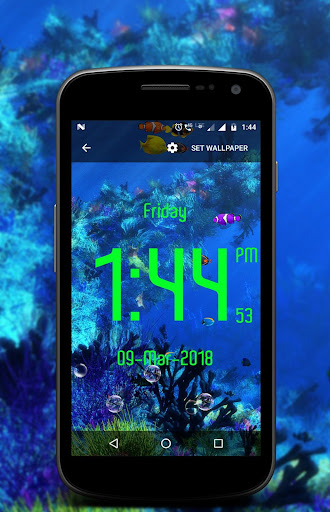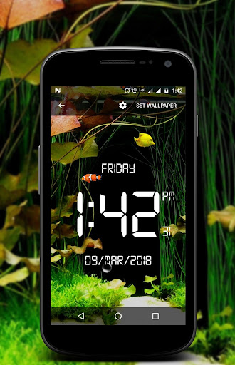 Set as wallpaper and decorate your mobile using this fancy digital clock with live fishes movement. This is the Aquarium clock live wallpaper with nature theme.