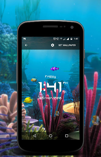 Install Aquarium Clock Live Wallpaper, a beautiful moving fish wallpaper which shows a beautiful digital clock on screen.