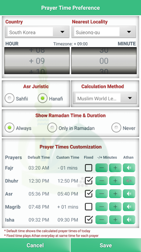 - Location and method based adjustable prayer times