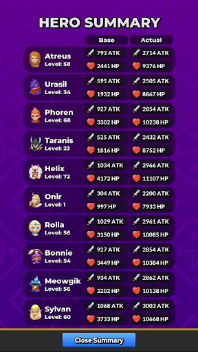 Change heroes and their levels to see the effect each hero has on your equipment.