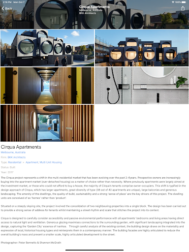 - Learn More – From the project feed, tap on any image to reveal the associated project description, location, architecture firm and more photos.