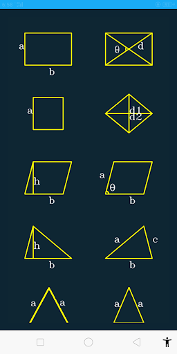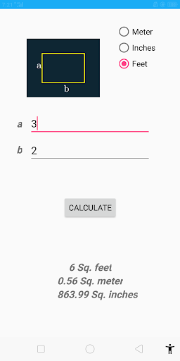 A variety of Geometrical shapes,Geometrical figures ,Field Area calculator ,Land area etc .Inputs can be given in meter,foot(feet),inch(inches).An Area measurement app