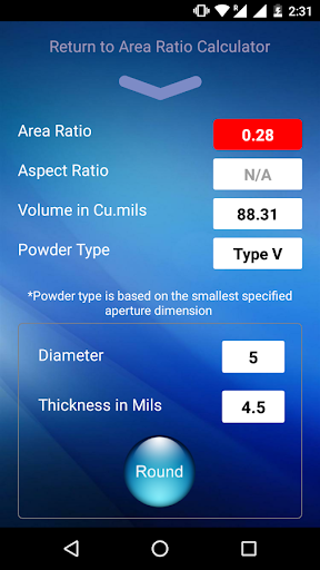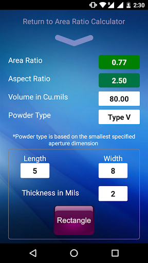 For solder paste selection the app will also indicate the recommended powder size for the indicated opening.