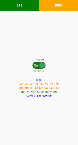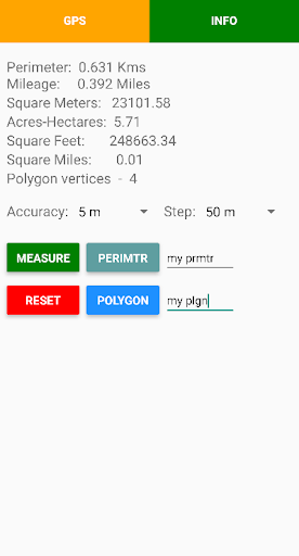 The registrator takes a polygon vertices coordinates through the mobile GPS-receiver and if GPS signal deviation is not out of accuracy setup restriction then it registering a vertex. The next vertex is registering when the distance from the last fixed vertex also exceeding the user defined distance threshold i.e. step. For the polygon area measurement required at least 3 registered vertices. The app also measures the polygon perimeter. By the way you can switch on the GPS-receiver only when required to register the polygon vertex. The polygon GPS registrator is also operating in background mode.