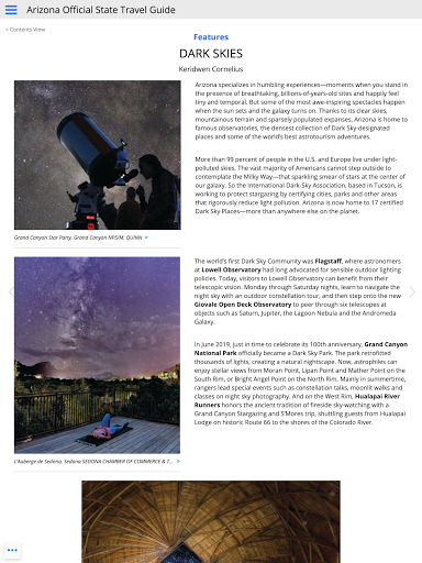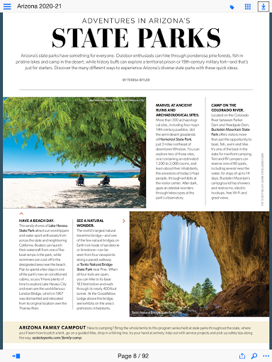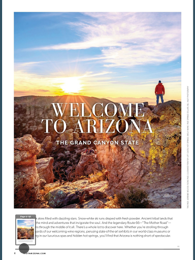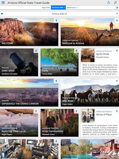 The 2020-2021 Arizona Official State Visitor’s Guide app takes users on a virtual journey through the state of Arizona. Swipe through feature stories highlighting each region of the state. Explore, enjoy, and engage with the Grand Canyon State.
