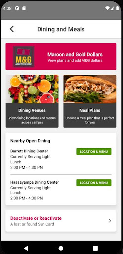 View and reload meal plan balances, add M&G, and view campus dining menus and nutrition information