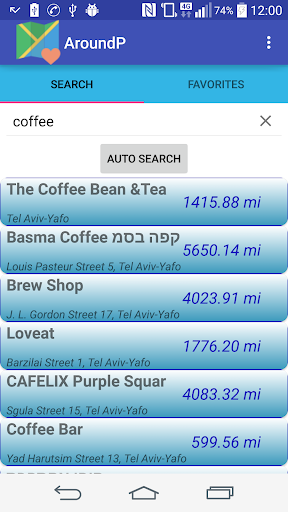 Around me is quickly identifies your position and allows you to search for the nearest places like: restaurant, Bank, Bar, Gas Station, Hospital, Hotel, supermarket, and more! Application show you how far the place that you search far from you.You can save places that you like in favorites or shear it by long click on the item, or use the auto search button that give you all places that located near your location. Also you can change the radius of search and metric system in settings.