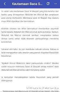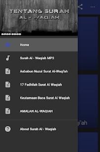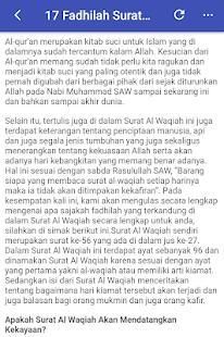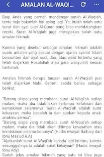 Asbabun Nuzul Surah Al - Waqiah serta kedahsyatan surah ini, dimana apabila seseorang mengamalkan surah ini Insa'allah rejeki akan terus mengalir tanpa henti. Di aplikasi ini juga tertera tentang bagaimana cara pengamalannya.