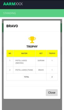 The AARM consists of five main match disciplines: rifle, carbine, men's pistol, ladies' pistol, and machine gun. Each discipline consists of an individual and a team match. The top three in each match are awarded gold, silver and bronze medals. The trophy categories include overall individual champion for each discipline, overall team champion for each discipline, and overall champion in the "falling plate" event for each discipline.