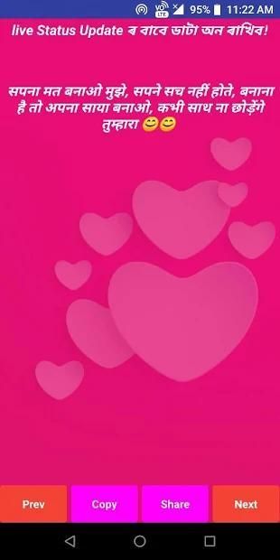 Event-based status: Apps Provide event base status for a special event Like Teachers Day wish, Independence day Status, Republic day Status, Diwali status, Diwali Shayari, valentine day status, valentine day Shayari, friendship status, friendship day status, new Year Status, Happy new Year Status, Navratri Status, Mothers day status, fathers day status, and much more available in Assamese, English, Hindi and Bengali language.