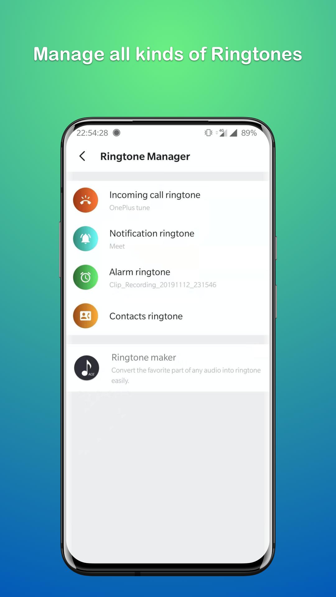 • Ringtone Manager (Default incoming call ringtone, Alarm ringtone, Notification ringtone, assign unique ringtone for each contact)
