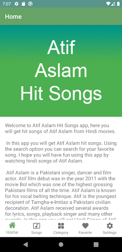 Atif Aslam is a Pakistani singer, dancer and film actor. Atif film debut was in the year 2011 with the movie Bol which was one of the highest grossing Pakistani films of all the time. Atif Aslam is known for his vocal belting technique. Atif is the youngest recipient of Tamgha-e-Imtiaz a Pakistani civilian decoration. Atif Aslam received several awards for lyrics, songs, playback singer and many other awards. In this app you will get Hindi Songs of Atif Aslam.