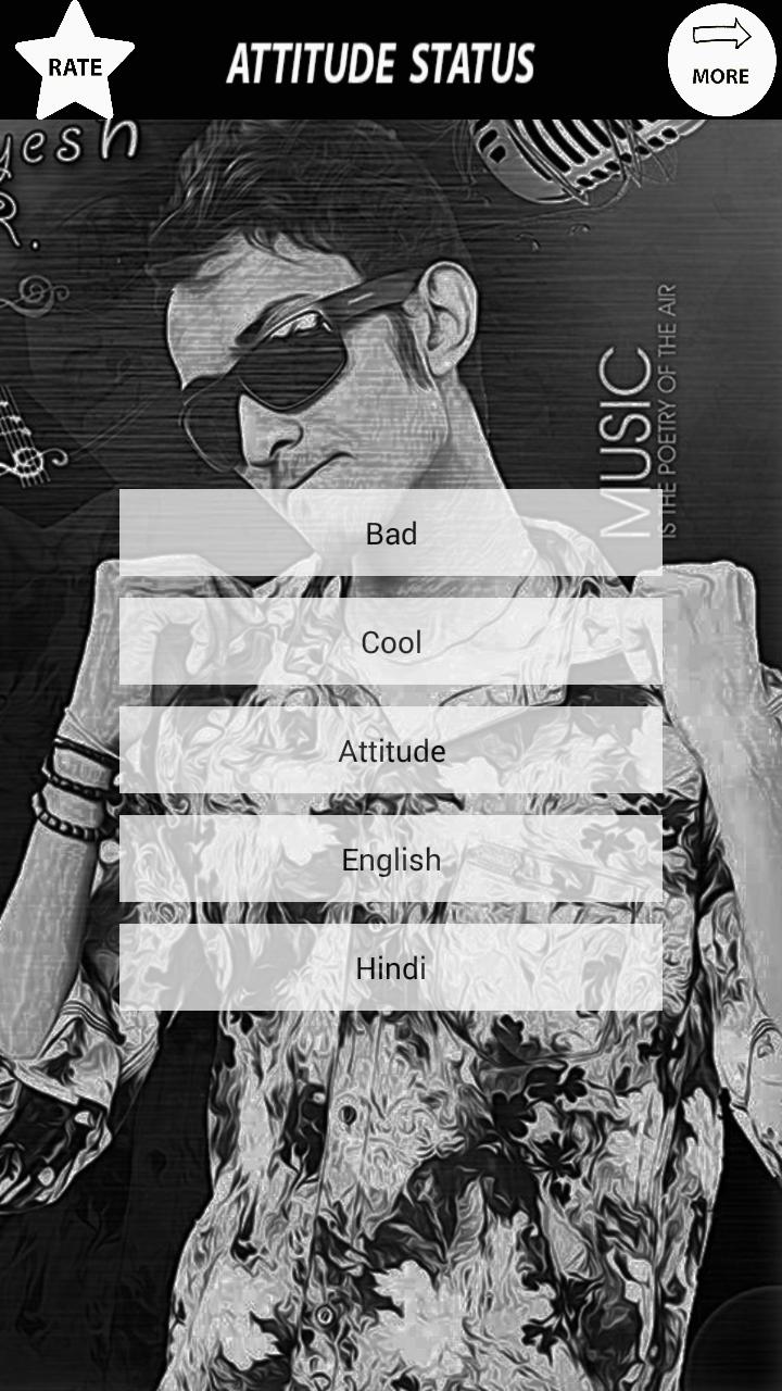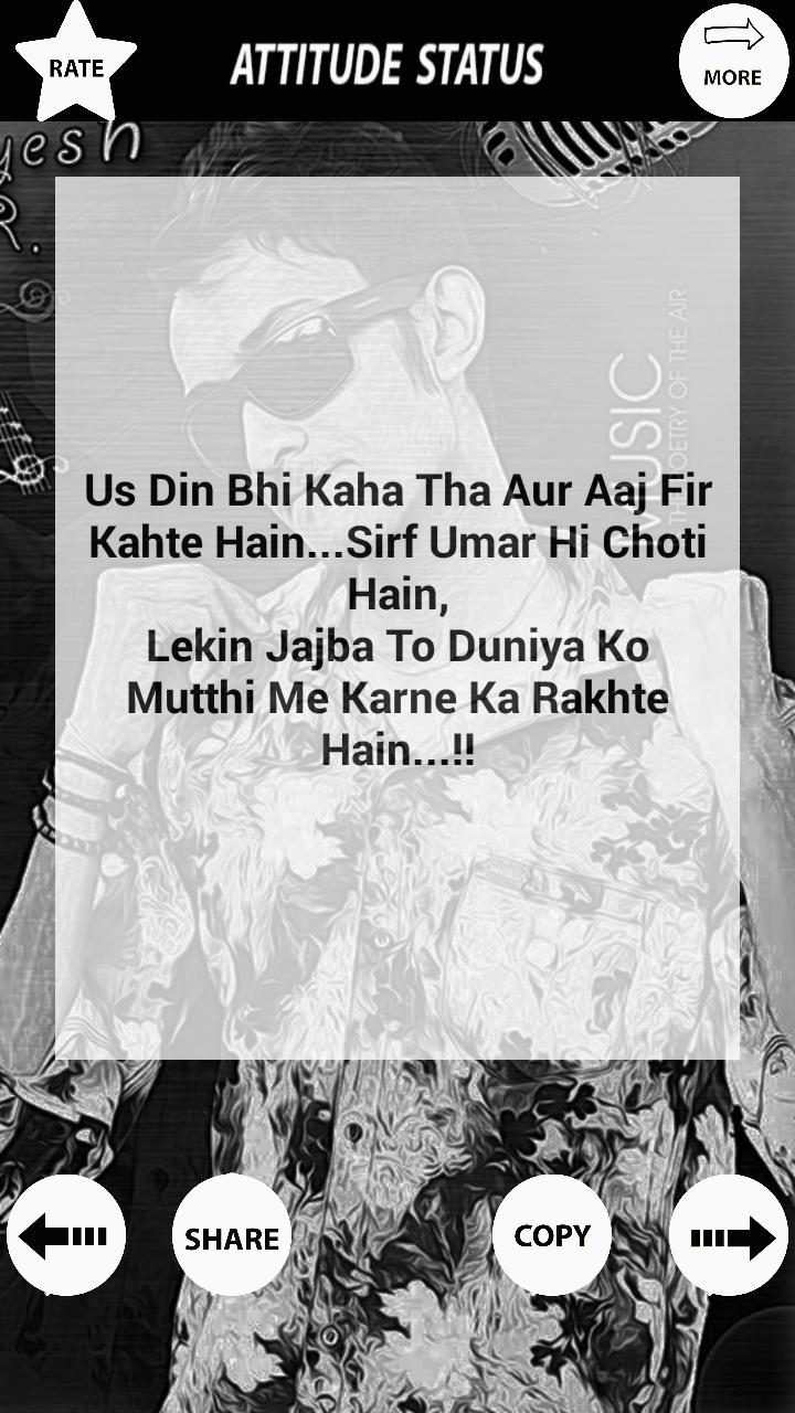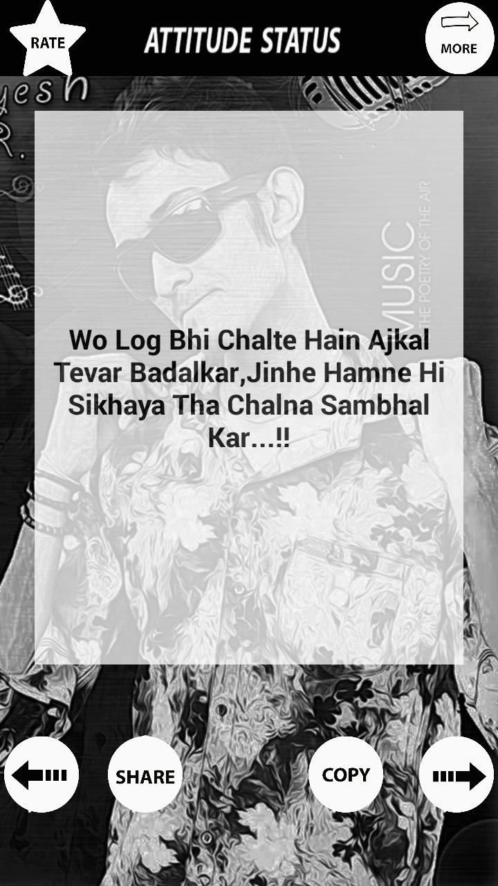 Attitude Status 2016-contains new status in market for year 2016.it has people are facing status crisis for their different social medial platforms.app provides solution for that.app contains huge variety of status that can help to users for describe their attitude on social media.app contains status in hindi also.user can share status on different mediums.content of app is added periodically.so that users can have new status in market.hope you like it..