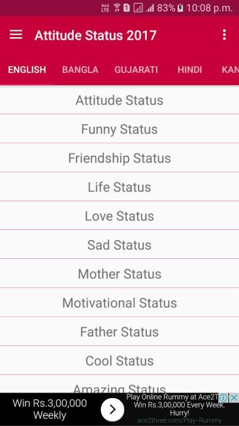 ● Choose Status From 3 Different Languages : Choose Huge Status collection from different languages like English, Gujarati and Hindi Status.