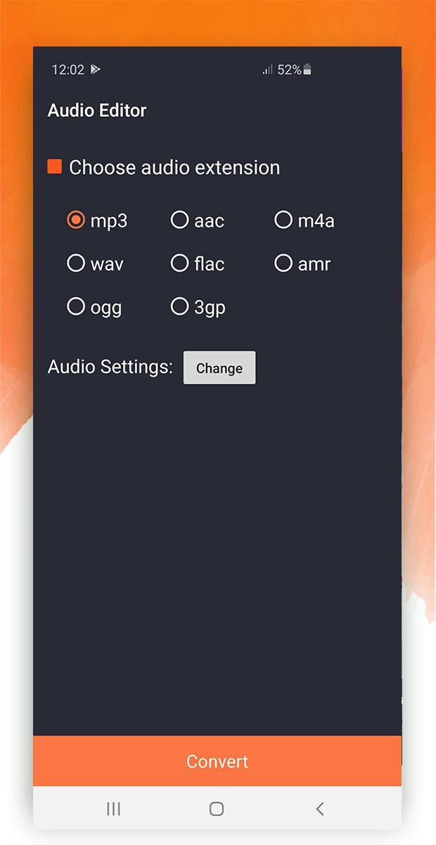 - Convert any audio to mp3, m4a, acc, wav, flac, amr, ogg, or 3gp