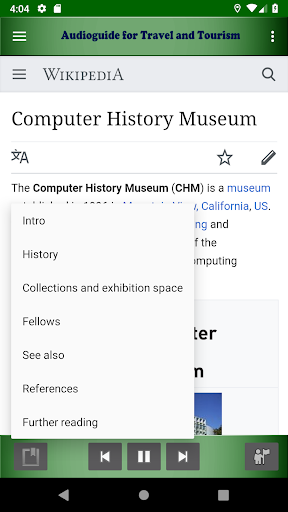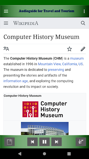 The Audio Tour Guide is also a voice reader of Wikipedia pages using the synthesis engine of your device. (TTS)