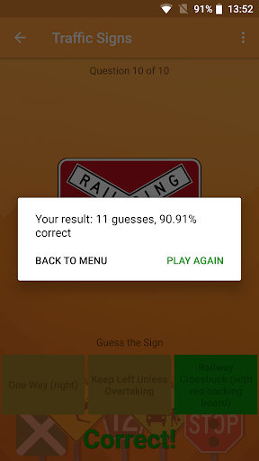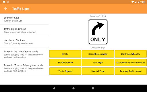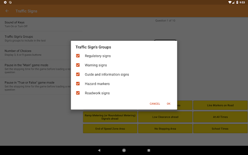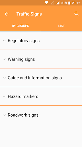 • Select the road sign's category. You can choose necessary groups of road signs to exercise and guess only their;